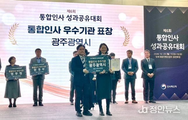 정안뉴스 기자 | 광주광역시는 23일 인사혁신처 주관 ‘제6회 통합인사 성과공유대회’에서 사회통합 및 균형인사 등의 성과에 따라 ‘통합인사 우수기관’으로 선정돼 인사혁신처장 표창을 받았다.