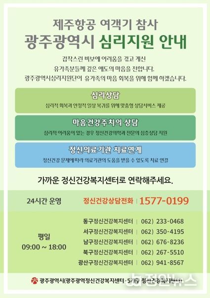 정안뉴스 기자 | 광주광역시는 제주항공 여객기 참사에 의한 심리적 충격을 완화하고 일상의 회복을 돕기 위해 심리지원을 강화한다.