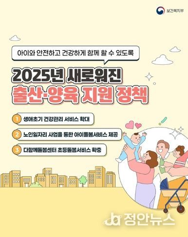 정안뉴스 안정주 기자 | 출산 후 산모와 아이를 위한 의료 및 건강관리 지원부터 신생아부터 초등생까지, 각 가정에 맞는 돌봄 지원으로 양육 부담을 완화하기 위한 2025년 새로워진 출산·양육 지원 정책을 소개합니다.