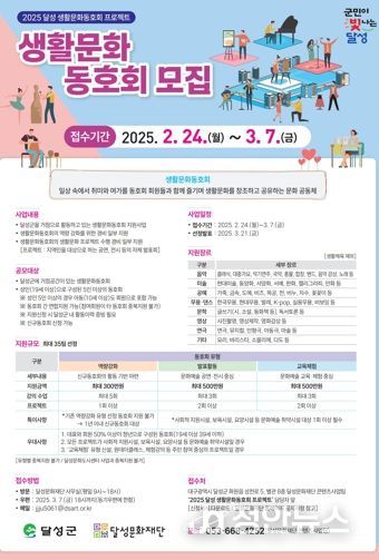 정안뉴스 안정주 기자 | (재)달성문화재단은 24일부터 3월 7일까지 ‘2025 달성 생활문화동호회 프로젝트’에 참여할 동호회를 모집한다고 밝혔다.