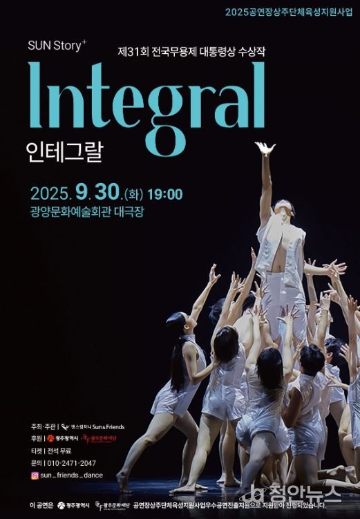 정안뉴스 안정주 기자 | 광주문화재단은 2025공연장상주단체육성지원사업 선정단체 댄스컴퍼니 Sun·Friends가 오는 9월 30일(화) 오후 7시, 광양문화예술회관 대극장에서 창작무용작'인테그랄(Integral)'공연을 펼친다고 밝혔다.