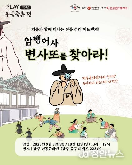 정안뉴스 안정주 기자 | 광주문화재단(대표이사 노희용) 전통문화관은 오는 9월 7일 오후 1시, 전통문화관에서 2025년 세 번째 ‘PLAY 무등풍류 뎐’ 프로그램을 개최한다. 이번 행사는 '조선으로의 시간여행-암행어사, 변사또를 찾아라!'라는 주제로, 관람객들에게 조선시대 마을의 일상을 생생히 체험할 수 있는 몰입형 역사 콘텐츠를 선보인다.