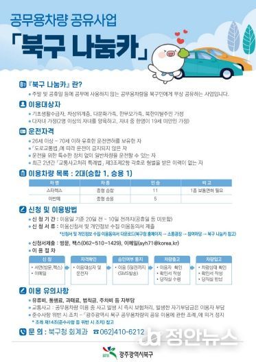 정안뉴스 안정주 기자 | 광주시 북구는 주말 및 공휴일에 운행하지 않는 공무용차량을 지역 주민들에게 무상으로 공유하는 ‘북구 나눔카’ 사업을 시행한다고 4일 밝혔다.