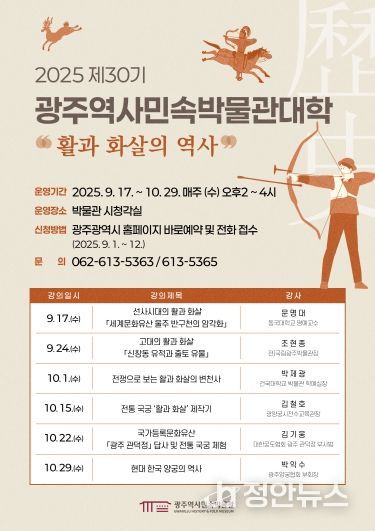 임찬혁 역사민속박물관장은 “이번 박물관대학은 기획전과 연계해 활과 화살의 기원을 폭넓게 이해할 수 있는 기회”라며 “시민들이 사냥·전쟁·스포츠·예술 등 다양한 분야에서 변화해 온 활과 화살의 의미를 깊이 알 수 있을 것으로 기대한다”고 말했다.