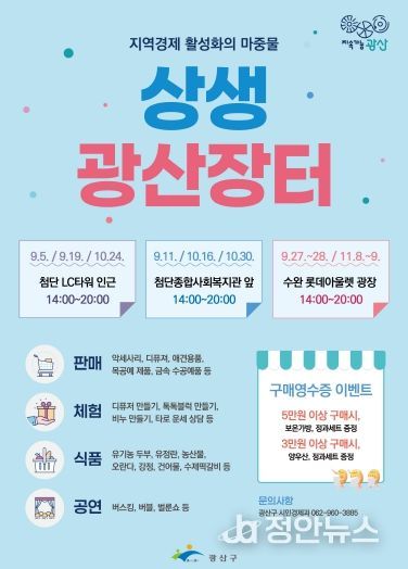 광산구 관계자는 “‘상생광산장터’는 지역 사회적 경제 기업과 소상공인, 시민이 함께 지역 경제와 사회를 함께 건강하게 하는 가치를 나누고, 확산하는 장”이라며 “지역 경제 활성화의 마중물이 되도록 많은 시민의 관심과 참여를 바란다”고 말했다.