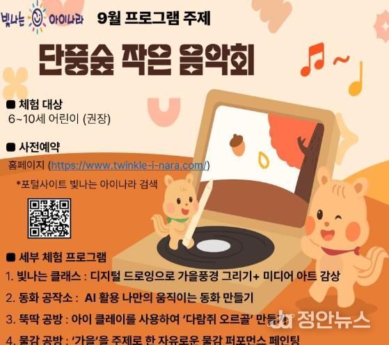 정안뉴스 안정주 기자 | 광주 동구는 금남 지하상가2공구에 문을 연 어린이 인공지능(AI) 기반 미디어아트 복합문화공간 ‘빛나는 아이나라’에서 9월부터 ‘단풍 숲 작은 음악회’를 주제로 한 프로그램을 6일부터 운영한다고 밝혔다.