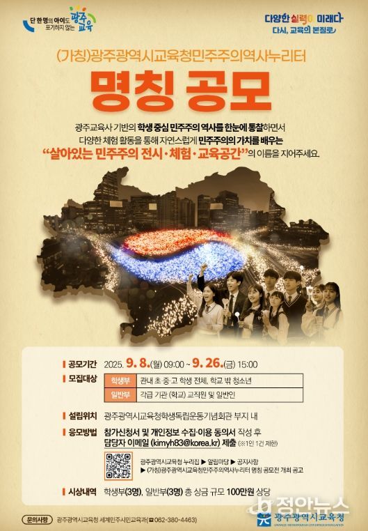 정안뉴스 안정주 기자 | 광주시교육청이 새롭게 건립하고 있는 민주주의 전시·체험공간 ‘(가칭)광주광역시교육청민주주의역사누리터의 명칭을 공모한다.
