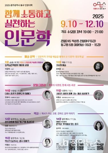 이어 ▲전후석 다큐멘터리 연출가 ‘디아스포라가 한반도의 미래다’(9월 24일) ▲박흥순 다문화평화교육연구소장 ‘사람과 사람이 함께 사는 세상 상상하기’(10월 1일) ▲김준 해양문화연구자 ‘광주공동체 중심 동구를 중심으로’(10월 29일) ▲한희원 화가 ‘치유의 미술’(11월 12일) ▲김서라 이미지 비평가 ‘흔적과 기억에서 찾는 광주’(11월 26일) ▲이동순 조선대 교수 ‘역사가 들려주는 광주 이야기’(12월 10일) 등이 구청 6층 대회의실에서 열린다.