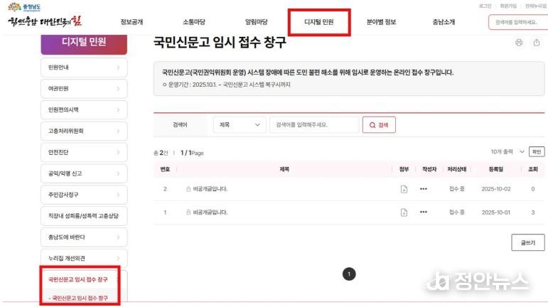 정안뉴스 황도연 기자 | 충남도는 2일부터 도 누리집에 ‘국민신문고 온라인 임시 접수 창구’를 개설·운영하고 있다고 밝혔다.