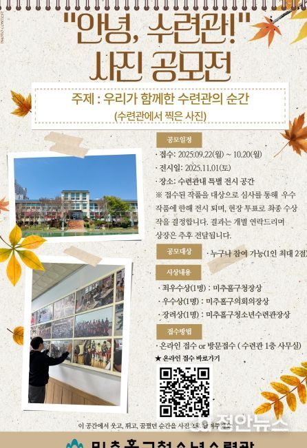 정안뉴스 안정주 기자 | 인천 미추홀구청소년수련관은 수련관 이전을 앞두고 지난 30여 년간의 추억을 함께 기록하기 위해 ‘안녕, 수련관’ 사진 공모전을 진행하고 있다고 2일 밝혔다.