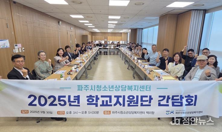 정안뉴스 안정주 기자 | (재)파주시청소년재단 파주시청소년상담복지센터(센터장 장문희)는 9월 30일 오후 3시, 센터 내 백리향에서 관내 초·중·고 33개교 교장을 대상으로 '2025년 청소년안전망 학교지원단 간담회'를 개최했다.