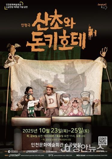 정안뉴스 안정주 기자 | 인천문화예술회관은 오는 10월 23일부터 25일까지 소공연장에서 예술무대산의 가족 인형극 〈산초와 돈키호테〉를 무대에 올린다. 이번 공연은 어린이 눈높이에 맞춘 명작을 소개하는 인천문화예술회관의 ‘어린이명작무대’의 일환으로 마련됐다.