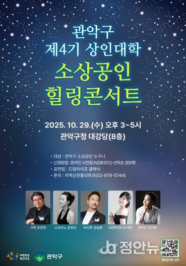 정안뉴스 안정주 기자 | 관악구는 오는 10월 29일 오후 3시, 구청 8층 대강당에서 관내 소상공인을 위한 힐링콘서트를 개최한다.