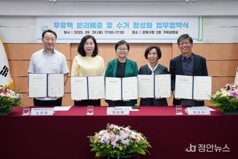 정안뉴스 안정주 기자 | 서울 강북구는 9월 29일(월) 구청 기획상황실에서 강북구어린이집연합회와 어진이마을관리 사회적협동조합과 함께 우유팩 분리배출 및 수거 활성화 기반 구축을 위한 업무협약을 체결했다고 밝혔다.