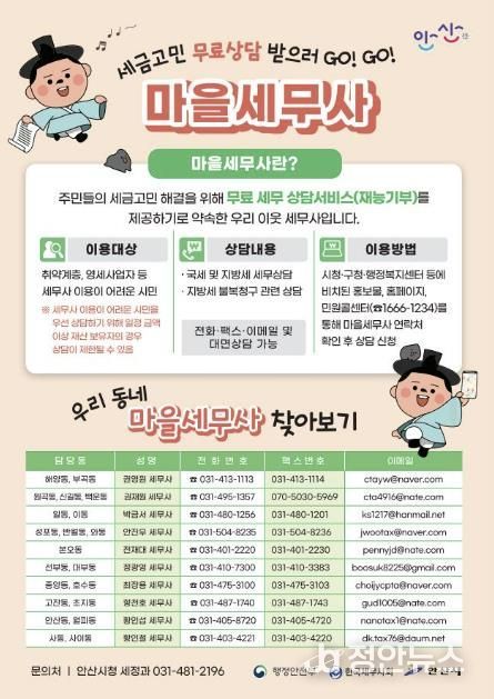 정안뉴스 안정주 기자 | 안산시는 올해 말까지 시민들에게 전문적인 세무 상담을 제공하기 위한 ‘제5기 마을세무사’ 제도를 운영한다고 10일 밝혔다.