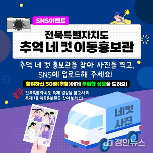 정안뉴스 안정주 기자 | 전북특별자치도는 10월 10일부터 11월 1일까지 도내 주요 축제 현장에서 ‘추억 네 컷 이동홍보관’을 운영한다고 밝혔다.