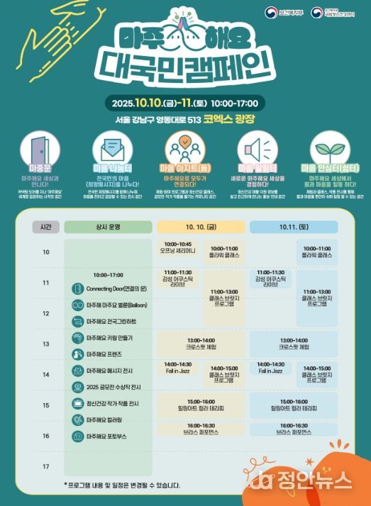 정안뉴스 안정주 기자 | 보건복지부와 국립정신건강센터는 ‘정신건강의 날’을 맞아 10월 10일에서 11일까지 양일간 서울 코엑스 야외광장에서 '마주해요! 대국민 캠페인'을 개최한다.