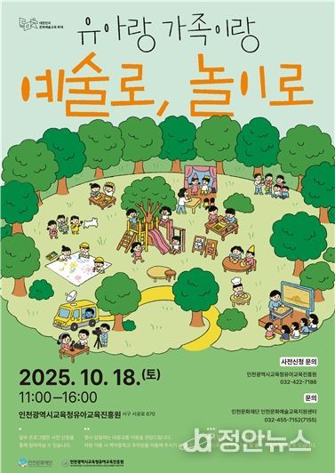 정안뉴스 안정주 기자 | (재)인천문화재단은 인천광역시교육청유아교육진흥원과 협력하여 2025 대한민국 문 화예술교육 축제와 연계된 '유아랑 가족이랑 예술로, 놀이로' 행사를 10월 18일 오전 11시부터 오후 4시까지 인천광역시교육청유아교육진흥원에서 개최한다.