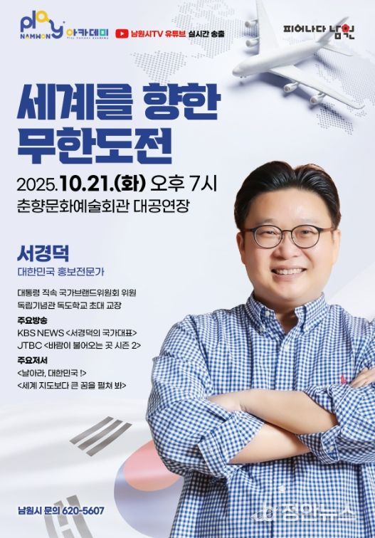 정안뉴스 안정주 기자 | 남원시는 오는 21일 오후 7시, 춘향문화예술회관 대공연장에서 대한민국 홍보 전문가 서경덕 교수를 초청해 “세계를 향한 무한도전”이라는 주제로 플레이(Play) 남원 아카데미를 개최한다.