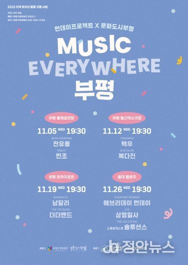 정안뉴스 안정주 기자 | 부평구 문화재단 문화도시센터는 오는 11월 매주 수요일 오후 7시 30분 지역 뮤지션들의 공연 ‘MUSIC EVERYWHERE 부평’을 총 4회에 걸쳐 진행한다고 밝혔다.
