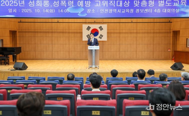 정안뉴스 안정주 기자 | 인천광역시교육청은 14일 관내 시교육청, 교육지원청, 직속기관의 기관장을 포함한 간부 공무원을 대상으로 성희롱·성폭력 예방을 위한 별도 교육을 실시했다고 밝혔다.