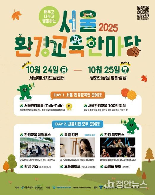 정안뉴스 안정주 기자 | 서울시와 녹색서울시민위원회는 10월 24일부터 25일까지 월드컵공원 내 서울에너지드림센터 및 평화광장 일대에서 서울 환경교육정책에 대해 알아보고 체험할 수 있는'2025 서울 환경교육한마당'을 개최한다. ‘배우고 나누고 행동하는 서울환경교육한마당’을 주제로 열리는 이번 행사는 서울 환경교육의 방향을 함께 논의하고 시민과 소통하는 자리로 마련된다.