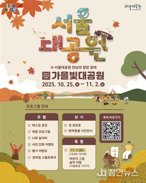정안뉴스 안정주 기자 | 서울대공원 2025년 가을단풍축제 ‘가을빛대공원’이 10월 25일부터 11월 2일까지 서울대공원 일대에서 개최된다. 공원 전체를 가을빛으로 물들인 형형색색의 단풍을 즐길 수 있는 절호의 기회이다.