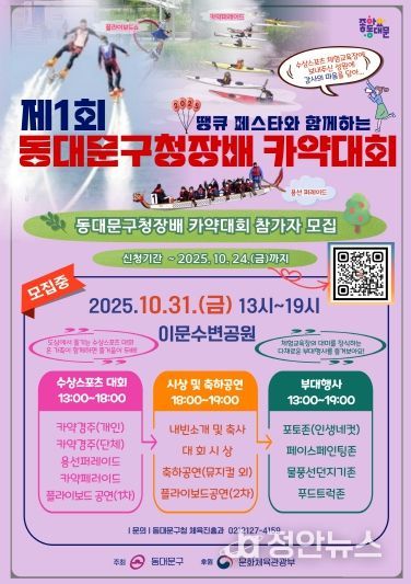 정안뉴스 안정주 기자 | 서울 동대문구는 오는 31일 오후 1시부터 7시까지 이문수변공원 내 동대문구 수상스포츠 체험교육장에서 ‘제1회 동대문구청장배 카약대회 및 2025 수상스포츠 땡큐 페스타’를 개최한다.