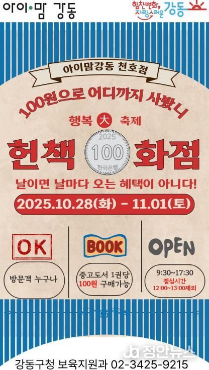정안뉴스 안정주 기자 | 강동구는 아이맘 강동 천호점 내 장난감 도서관에서 대여됐던 도서 중 상태가 양호한 책을 권당 100원에 판매하는 ‘헌책 100화점’ 행사를 개최한다고 27일 밝혔다.