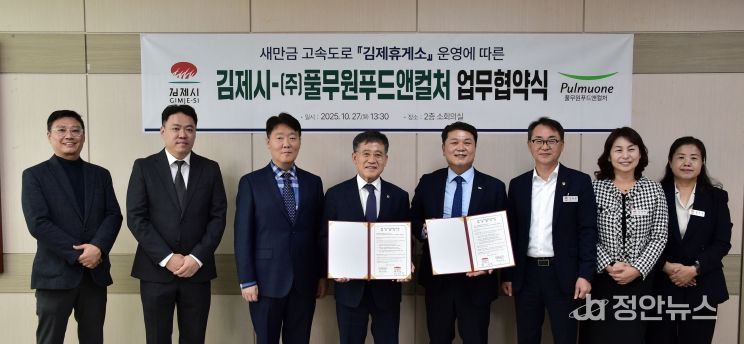 정안뉴스 안정주 기자 | 김제시는 27일 ㈜풀무원푸드앤컬처와 '새만금전주간' 고속도로 개통에 따라 새롭게 조성되는‘김제휴게소’운영에 따른 업무협약을 체결했다고 밝혔다.