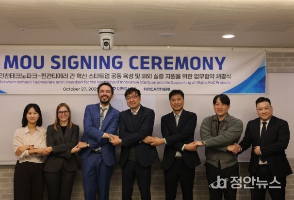 정안뉴스 안정주 기자 | 인천테크노파크(인천TP)는 27일 인천스타트업파크에서 이탈리아 국영 조선사 핀칸티에리(Fincantieri)와 ‘혁신 스타트업 육성 및 해외 실증 지원’에 상호 협력 내용으로 업무협약을 체결했다.