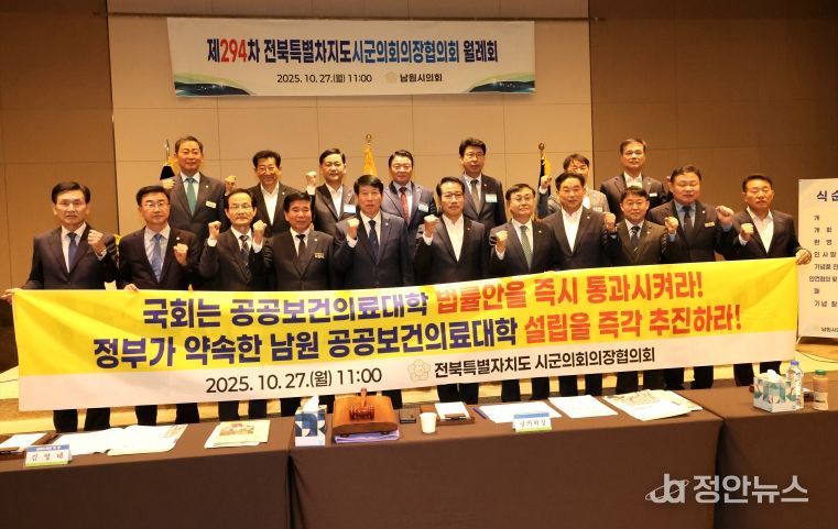 정안뉴스 안정주 기자 | 전북특별자치도시군의회의장협의회(회장 남관우 전주시의회 의장)는 27일 남원시의회에서 열린 제294차 월례회에서 공공의대법안 통과 촉구 건의안을 채택하고, 정부와 국회에 조속한 법안 통과를 강력히 촉구했다.