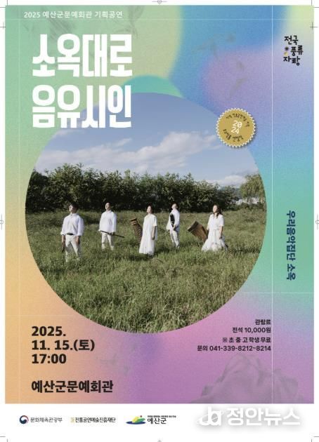 정안뉴스 황도연 기자 | 예산군문예회관은 오는 11월 15일 오후 5시, 퓨전국악 공연 ‘소옥대로 음유시인’을 선보인다.