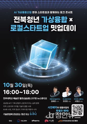 전주정보문화산업진흥원(원장 허전)은 오는 30일 전주대학교 예술관 별관 217호에서 지역 내 첨단 디지털 융합기술 창업 활성화를 위한 ‘전북청년 가상융합×로컬스타트업 밋업데이’ 토크콘서트를 개최한다.