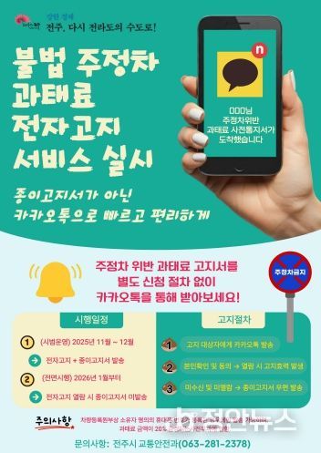 최준범 전주시 대중교통국장은 “전자고지 서비스 시행으로 업무 효율성 제고는 물론 행정서비스 만족도 향상에 도움이 될 것으로 기대한다”면서 “앞으로도 시민 편의 증진을 위한 다양한 디지털 행정 서비스를 추진하겠다”고 말했다.