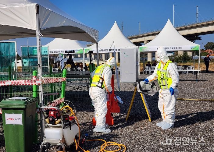 군산시 및 관계기관들도 현장훈련을 통해 ▲의심축 신고에 따른 초동 대응 및 준비사항 점검 ▲의사환축 확인 및 대응 ▲살처분 ▲상황 해제 ▲사후관리 순으로 방역조치 전 과정을 점검했다.