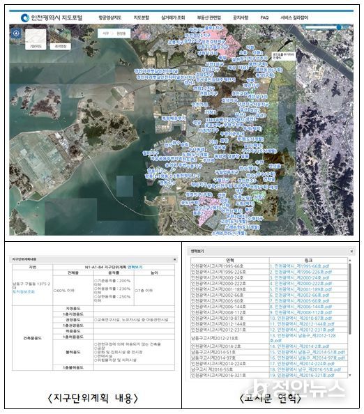 시민은 인천시 지도포털에 접속해 주소 입력 또는 위치 선택만으로 해당 토지의 지번, 지목, 면적 등 기본정보와 함께 지구단위계획구역, 건축물 용도, 건폐율, 용적률, 높이 등 세부정보를 한눈에 확인할 수 있다. 또한, 각 구역별 고시문 다운로드 기능도 제공된다.