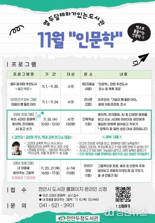정안뉴스 황도연 기자 | 천안시 두정도서관은 11월 한 달간 ‘인문학’을 테마로 도서관을 운영한다고 3일 밝혔다.