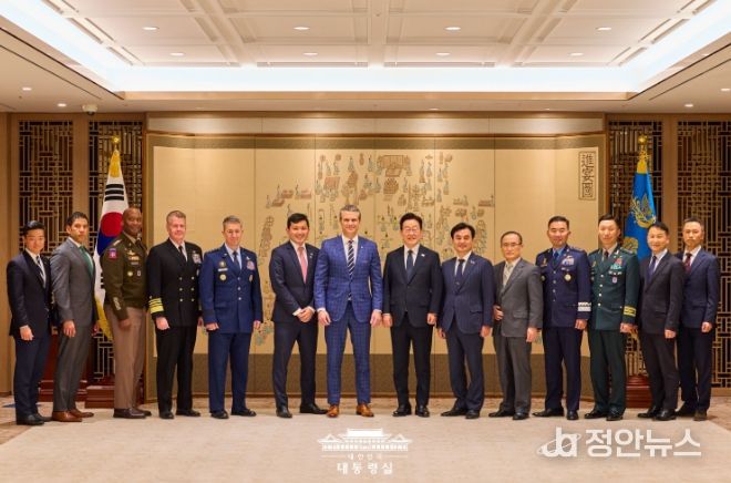 정안뉴스 안정주 기자 | 이재명 대통령은 11월 4일 오후 대통령실에서 한미안보협의회의(SCM : Security Consultative Meeting) 참석을 위해 한국을 방문한 피트 헤그세스 미국 전쟁부장관의 예방을 받고 한미동맹이 미래형 포괄적 전략동맹으로 심화 발전해 나가는 데 있어 헤그세스 장관의 중요한 역할을 당부했다.