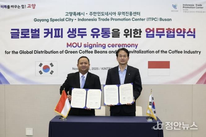 정안뉴스 안정주 기자 | 고양특례시는 지난 6일, ‘2025 카페·베이커리페어 시즌2’가 열리고 있는 킨텍스에서 주한인도네시아 무역진흥센터(ITPC 부산)와 ‘글로벌 커피 생두 유통 협력 협약’을 체결했다.