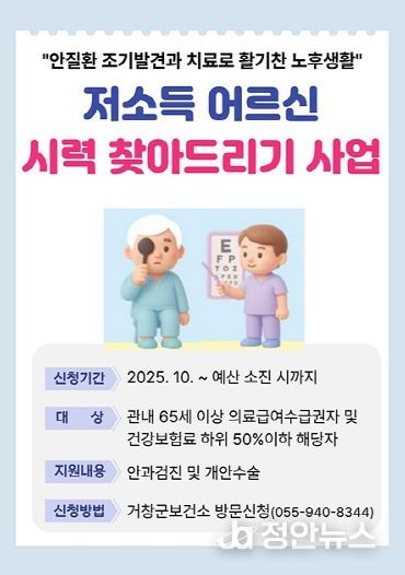 지원대상은 거창군에 거주하는 의료급여수급권자와 건강보험료 기준(직장가입자 127,500원 이하, 지역가입자 57,000원)에 해당하는 65세 이상 노인이다. 군은 안과검진과 개안수술을 지원함으로써 경제적 부담을 덜어드리는 동시에, 시력 저하로 인한 일상 속 불편을 해소하고, 삶의 질 향상과 사회적 고립 예방에도 힘쓰고 있다.