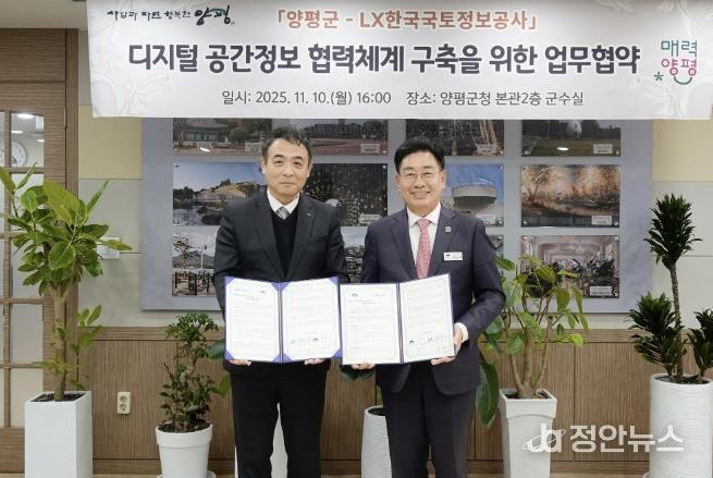 정안뉴스 안정주 기자 | 양평군은 지난 10일 LX한국국토정보공사와 ‘디지털 공간 정보 협력체계 구축을 위한 업무협약(MOU)’을 체결하고, 군민이 체감할 수 있는 스마트 행정 서비스 확대에 나섰다.