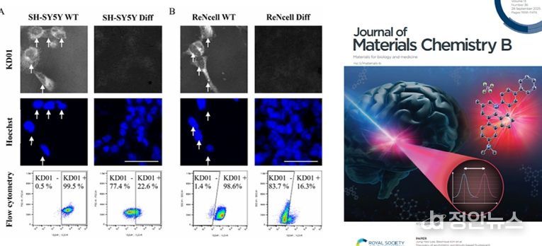 연구진은 비대칭 피리디늄 염(Asymmetric pyridinium salt) 구조 기반의 형광 화합물 라이브러리를 구축하고, 살아있는 신경줄기세포에만 반응해 강한 형광을 발현하는 화합물 ‘KD01’을 도출했다.
