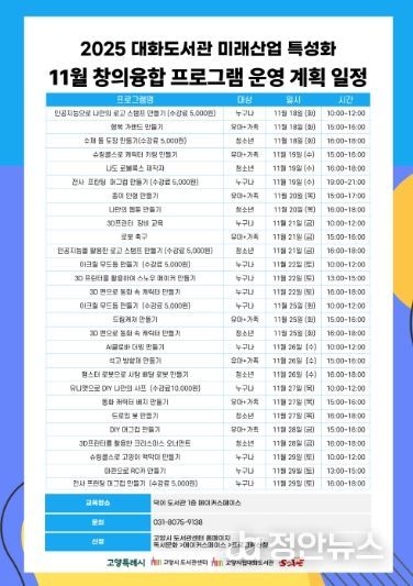정안뉴스 안정주 기자 | 고양특례시 대화도서관은 덕이도서관 1층 메이커스페이스(이전 공간)에서 초등학생부터 성인을 대상으로 11월 ‘미래산업 특성화 창의융합 프로그램’을 운영한다고 밝혔다.