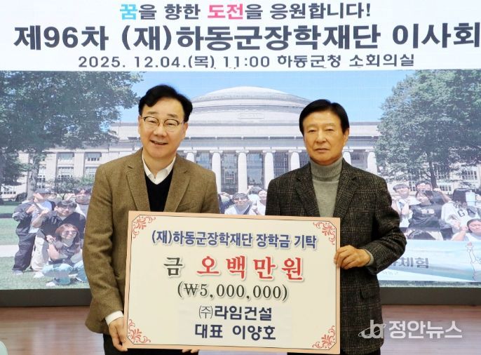 정안뉴스 김재홍 기자 | (재)하동군장학재단 이양호 이사장이 지난 4일 열린 제96차 하동군장학재단 이사회에 앞서 지역 인재 육성을 위한 장학기금 500만 원을 출연하며, 22년째 후학 사랑을 실천하고 있다.