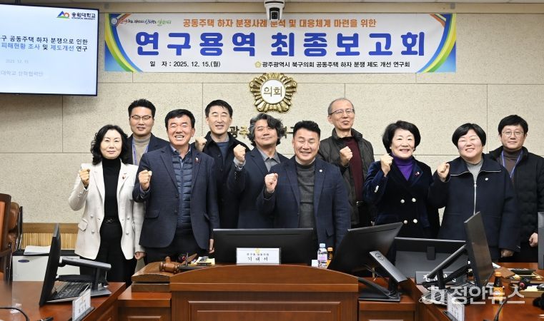 정안뉴스 안정주 기자 | 광주 북구의회 ‘공동주택 하자 분쟁 제도 개선 연구회’(기대서 대표의원)는 지난 15일 '공동주택 하자 분쟁으로 인한 주민 피해현황 조사 및 제도개선 연구' 최종보고회를 개최하며 9개월간의 연구활동을 성공적으로 마무리했다.