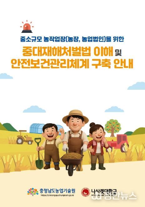 정안뉴스 황도연 기자 | 충남도 농업기술원은 농업 분야 특성을 반영한 ‘중대재해처벌법 이해 및 안전보건관리체계 구축 안내서’를 제작해 농업현장에 보급했다고 17일 밝혔다.