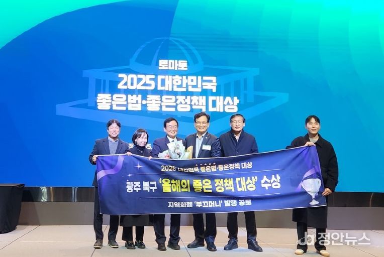 정안뉴스 안정주 기자 | 광주광역시 북구가 ‘2025년 좋은법·좋은정책 대상’ 시상식에서 지역화폐 부끄머니 발행 사례가 ‘올해의 좋은정책 대상’으로 선정됐다고 17일 밝혔다.