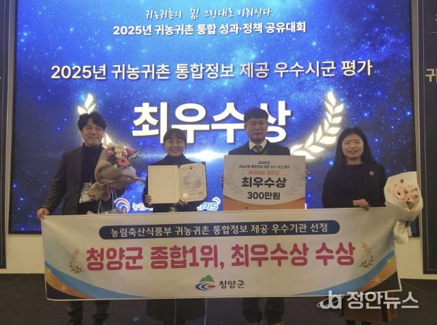 정안뉴스 황도연 기자 | 청양군은 농림축산식품부가 주관한 2025년 귀농귀촌 통합정보 제공 우수 시·군 평가에서 전국 1위를 차지하며 최우수상을 수상했다고 18일 밝혔다.