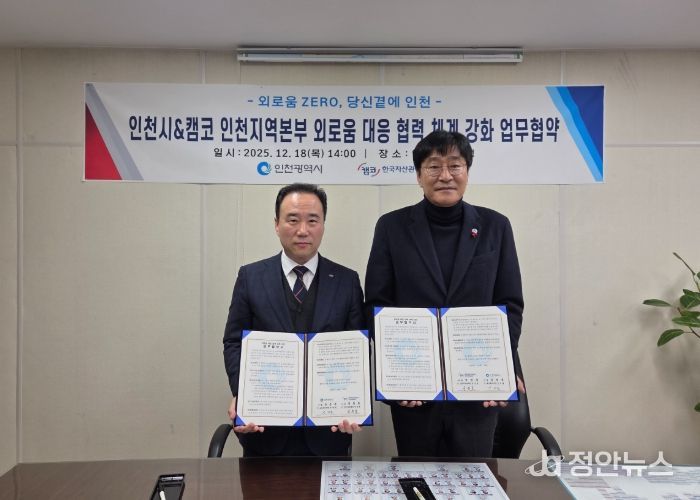 인천시는 12월 18일 캠코(한국자산관리공사) 인천지역본부와 외로움 돌봄 지원사업 추진' 및 '지역사회 발전사업'을 위한 업무협약을 체결했다고 밝혔다.